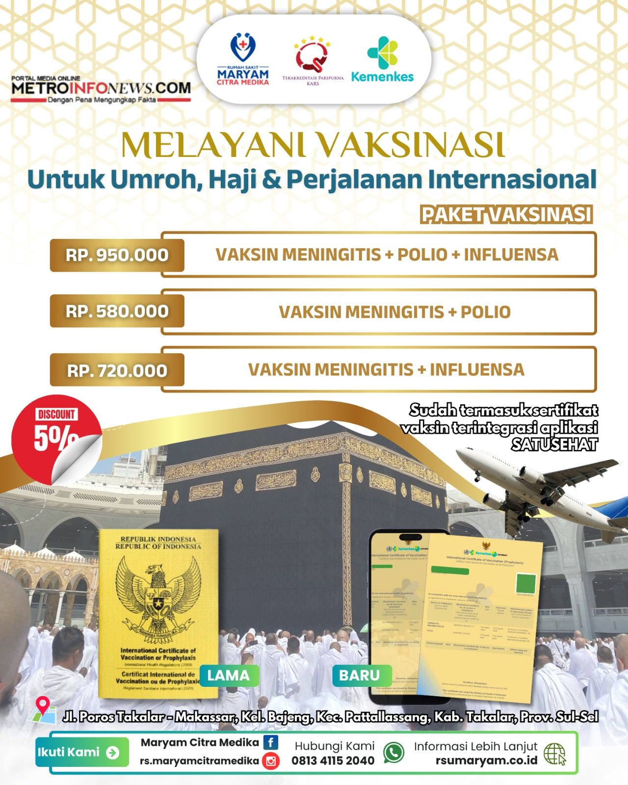METROINFONEWS.COM I Takalar, Rabu 05 November 2025. Bagi Anda yang berencana menunaikan ibadah umroh, haji, atau melakukan perjalanan internasional, Rumah Sakit Maryam Citra Medika (RSMCM) Takalar menghadirkan layanan vaksinasi terbaru yang memudahkan dan memberikan kenyamanan.