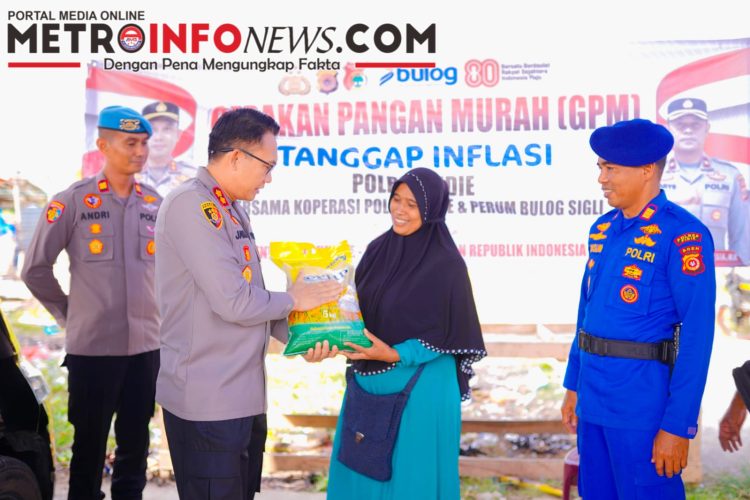 METROINFONEWS.COM | PIDIE – Kapolres Pidie AKBP Jaka Mulyana, SIK, MIK, memantau langsung pelaksanaan Gerakan Pangan Murah (GPM) yang digelar Koperasi Polres Pidie bekerja sama dengan Bulog di Pasar Pante Teungoh, Kecamatan Kota Sigli, Rabu (20/8/2025)