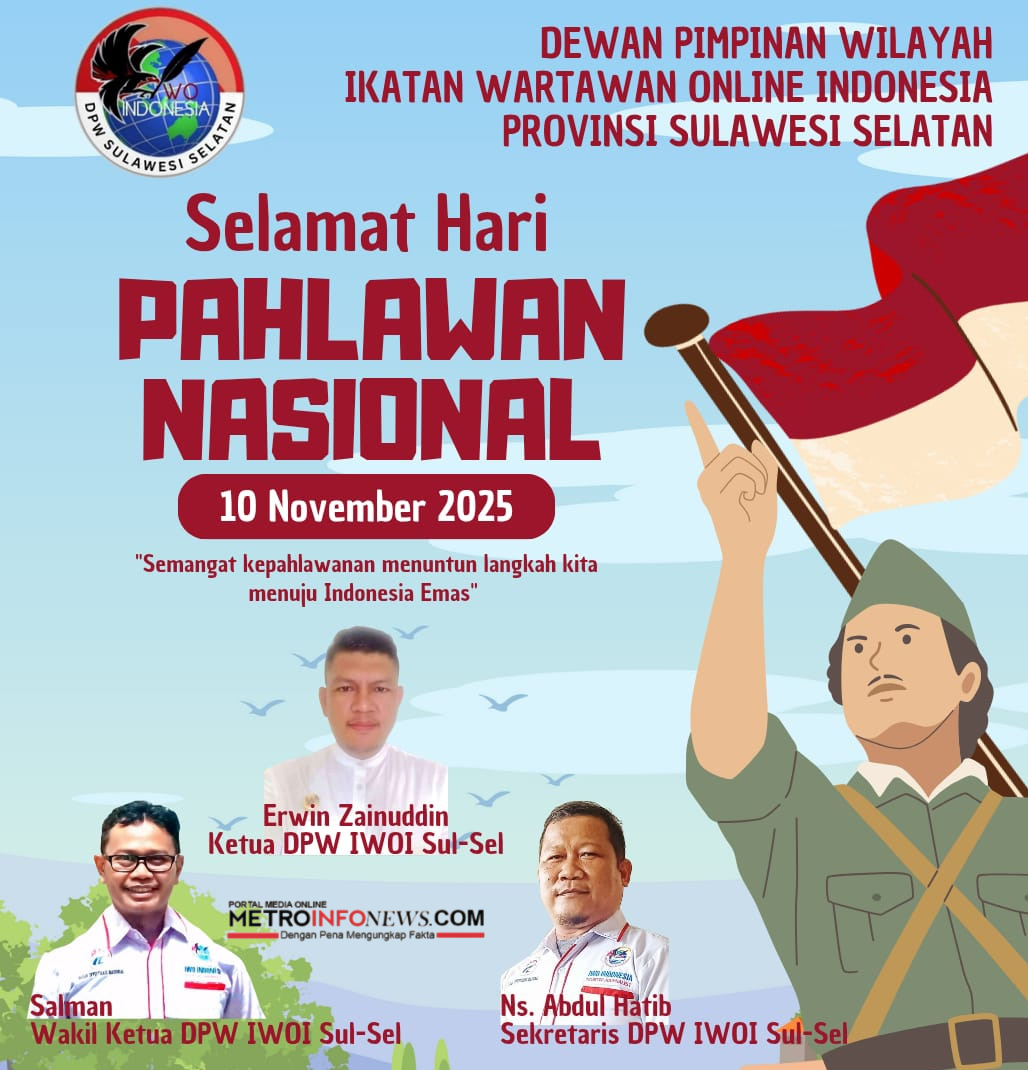 Dewan Pimpinan Wilayah Ikatan Wartawan Online Indonesia (IWOI) Provinsi Sulawesi Selatan menegaskan pentingnya menghidupkan kembali semangat perjuangan dan integritas dalam dunia jurnalistik modern. Dengan mengusung tema “Semangat Kepahlawanan Menuntun Langkah Kita Menuju Indonesia Emas”, IWOI Sulsel mengajak para wartawan untuk menjadikan nilai kepahlawanan sebagai energi perubahan menuju masa depan Indonesia yang lebih bermartabat.