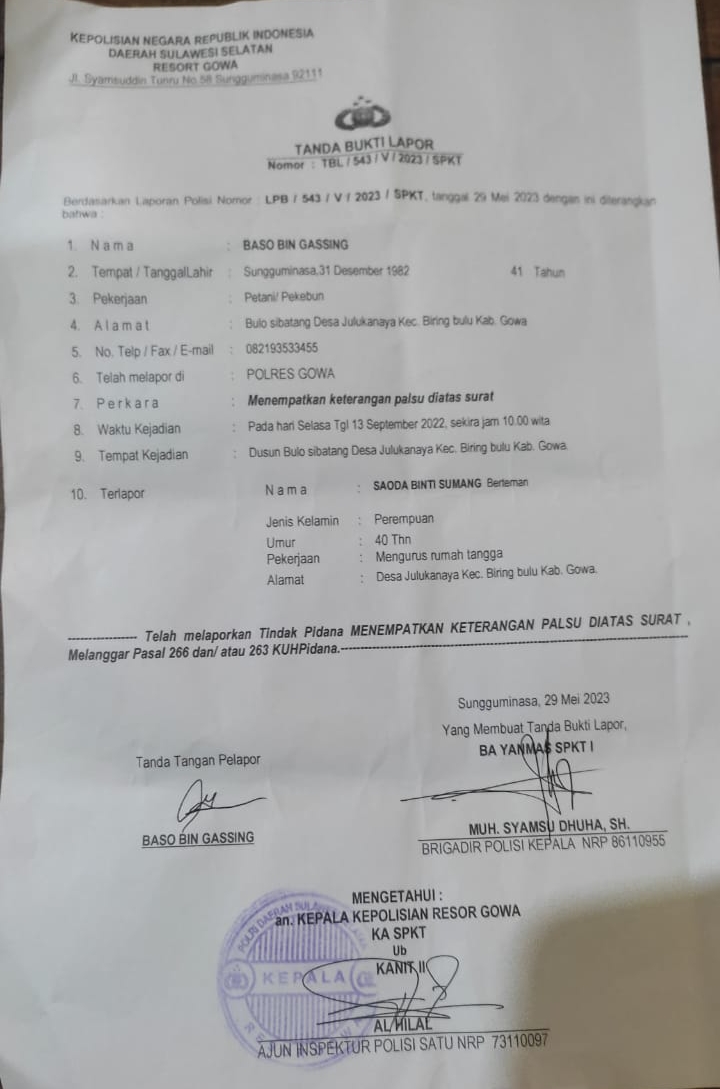 Kasus ini mencuat setelah Baso bin Gassing melaporkan dugaan pemalsuan Surat Pernyataan Fisik Bidang Tanah (SPORADIK) ke Polres Gowa dengan nomor registrasi laporan LP/B/543/V/2023/Sulsel/Res Gowa/SPKT, tertanggal 29 Mei 2023. Penyidikan terhadap perkara ini diperkuat dengan Surat Perintah Penyidikan Nomor SP.Sidik/351/V/Res.1.9/2023/Reskrim tanggal 20 Mei 2023 dan SPDP ke Kejaksaan Negeri Gowa dengan Nomor SPDP/243/2023/VII/Res.1.9/2023/Reskrim tertanggal 20 Juli 2023.