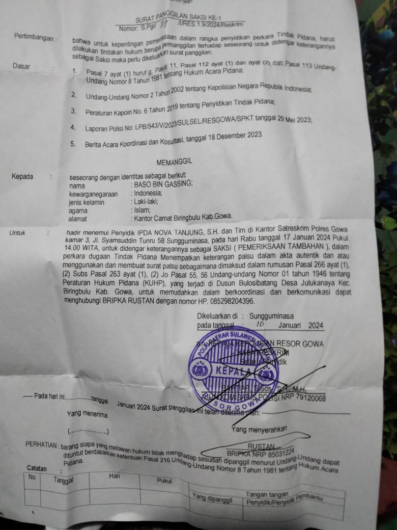 Kasus ini mencuat setelah Baso bin Gassing melaporkan dugaan pemalsuan Surat Pernyataan Fisik Bidang Tanah (SPORADIK) ke Polres Gowa dengan nomor registrasi laporan LP/B/543/V/2023/Sulsel/Res Gowa/SPKT, tertanggal 29 Mei 2023. Penyidikan terhadap perkara ini diperkuat dengan Surat Perintah Penyidikan Nomor SP.Sidik/351/V/Res.1.9/2023/Reskrim tanggal 20 Mei 2023 dan SPDP ke Kejaksaan Negeri Gowa dengan Nomor SPDP/243/2023/VII/Res.1.9/2023/Reskrim tertanggal 20 Juli 2023.