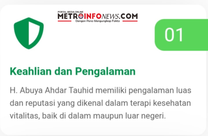 METROINFONEWS.COM | BANTUL — H. Abuya Ahdar Tauhid adalah ahli terapi kesehatan vitalitas yang terkemuka di BANTUL, menyediakan solusi pengobatan alami untuk masalah vitalitas pria dan kesehatan wanita. Menggunakan metode tradisional seperti pijat dan ramuan herbal, Beliau membantu mengatasi berbagai masalah reproduksi lainnya. Terapi yang ditawarkan tidak hanya fokus pada perbaikan fisik tetapi juga mencakup pendekatan holistik untuk mencapai keseimbangan tubuh dan pikiran, memberikan hasil yang aman dan permanen tanpa efek samping.