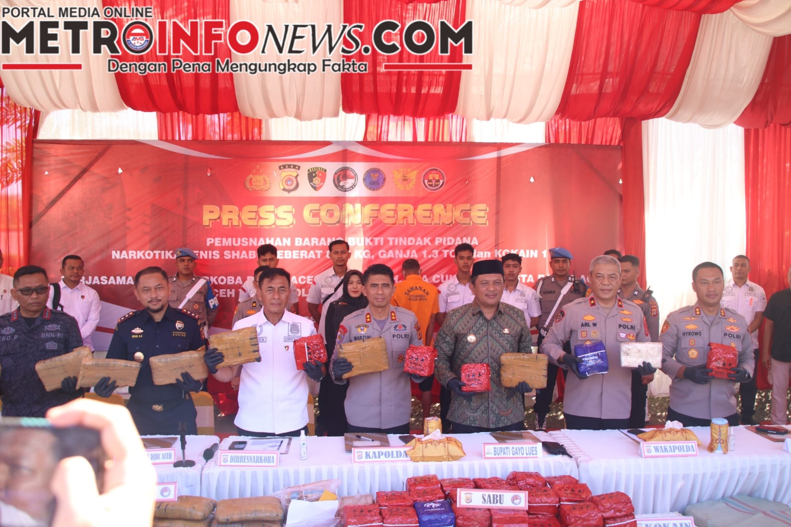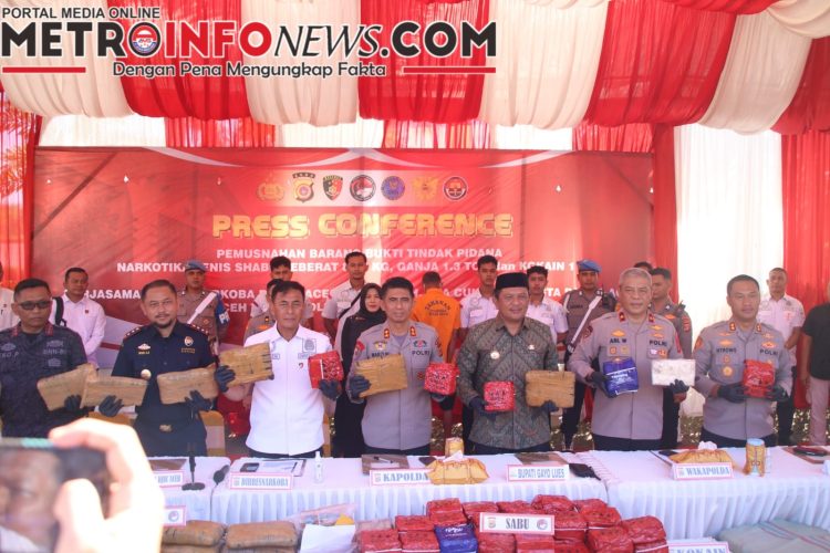 METROINFONEWS.COM | BANDA ACEH — Ditresnarkoba Polda Aceh bersama Badan Narkotika Nasional Provinsi (BNNP) Aceh, Direktorat Jenderal Bea dan Cukai, Polresta Banda Aceh, Polres Aceh Timur, Polres Gayo Lues, dan Polres Sabang berhasil menggagalkan peredaran narkotika jenis sabu seberat 80,5 kilogram, ganja 1,3 ton, serta kokain 1 kilogram dalam kurun waktu tiga bulan terakhir.