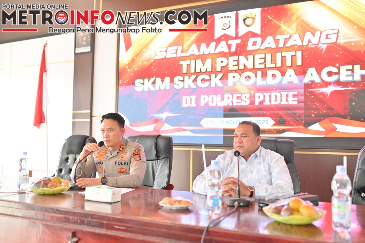 METROINFONEWS.COM | PIDIE  – Polres Pidie menerima kunjungan tim peneliti Survey Kepuasan Masyarakat (SKM) SKCK Polda Aceh yang bertempat di Aula Wira Satya Polres Pidie. Senin (10/11/2025).