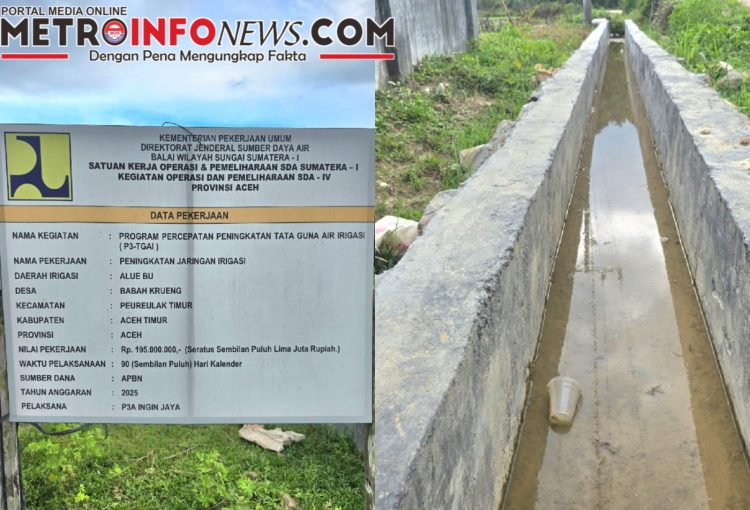 METROINFONEWS.COM | ACEH TIMUR – Proyek pembangunan saluran irigasi yang dilaksanakan oleh Perkumpulan Petani Pemakai Air (P3A) di Gampong Alue Bu, Kecamatan Peureulak Timur, Kabupaten Aceh Timur, menuai sorotan dari warga setempat. Pekerjaan yang bersumber dari anggaran pemerintah tersebut diduga dikerjakan tidak sesuai dengan spesifikasi teknis (spek) yang telah ditentukan.