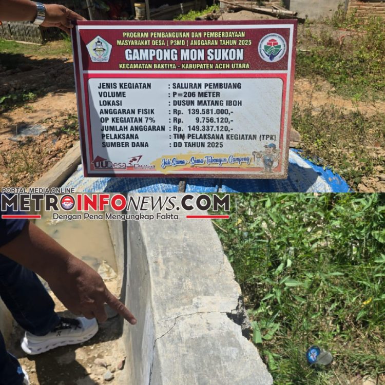 METROINFONEWS.COM | ACEH UTARA – Saluran pembuangan air berada di Gampong Mon Sukon, Kecamatan Baktiya, Kabupaten Aceh Utara, Provinsi Aceh mendapat sorotan dari masyarakat Gampong setempat. Pasalnya, pekerjaan Saluran Pembuangan air belum selesai dikerjakan yang bersumber dari Anggaran Dana Desa (ADD) tahun 2025 sudah retak dan patah di beberapa ruas.